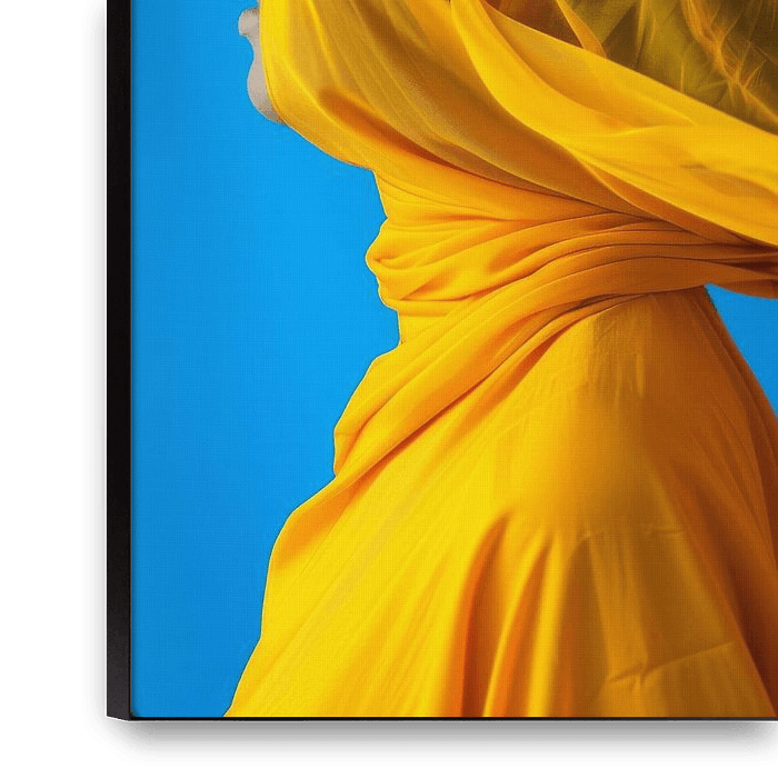 Das Bild zeigt eine faszinierende Figur, deren Kopf und Körper in leuchtend gelbes Tuch gehüllt sind. Die sanften, fließenden Linien des Stoffes schaffen eine dynamische Bewegung vor dem strahlend blauen Hintergrund, der die Intensität der Farben verstärkt. Diese Kombination betont die Eleganz und Anmut der dargestellten Person.