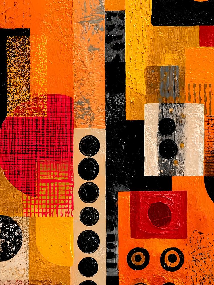 Eine abstrakte Komposition mit einer lebendigen Mischung aus geometrischen Formen und Mustern. Die Farbpalette besteht aus leuchtenden Orange-, Gelb-, Rot- und Schwarztönen, die einen dynamischen Kontrast bilden. Strukturierte Elemente schaffen Tiefe, die Komposition ist visuell ausgewogen und führt das Auge durch das Zusammenspiel von Farbe und Form.