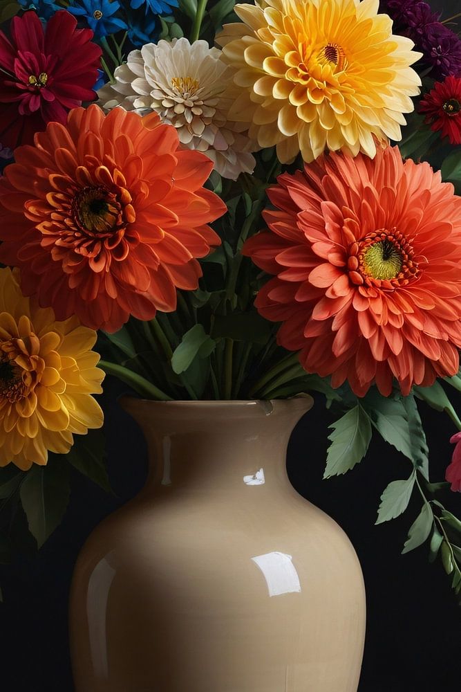 Dieses lebendige Stillleben einer farbenfrohen Blumenvase bringt die Natur direkt in Ihre Wohnräume. Die sorgfältig ausgewählte Palette aus leuchtenden Rottönen, sonnigen Gelbtönen, himmlischen Blautönen und warmen Orangetönen schafft eine angenehme Harmonie, die jeden Raum erhellen kann. Jede Blume scheint mit Präzision und Aufmerksamkeit platziert worden zu sein, so dass ein organisiertes Chaos von Farben und Formen entsteht, das die Vielfalt und Schönheit der natürlichen Welt verkörpert. Dieses Kunstwerk ist nicht nur eine Augenweide, sondern auch eine Ode an die üppige Vielfalt der blühenden Pflanzenwelt. Es ist ein wunderschöner Blickfang in jedem Wohnzimmer, Büro oder in der Küche und ein perfekter Gesprächspartner für Gäste und Familie.