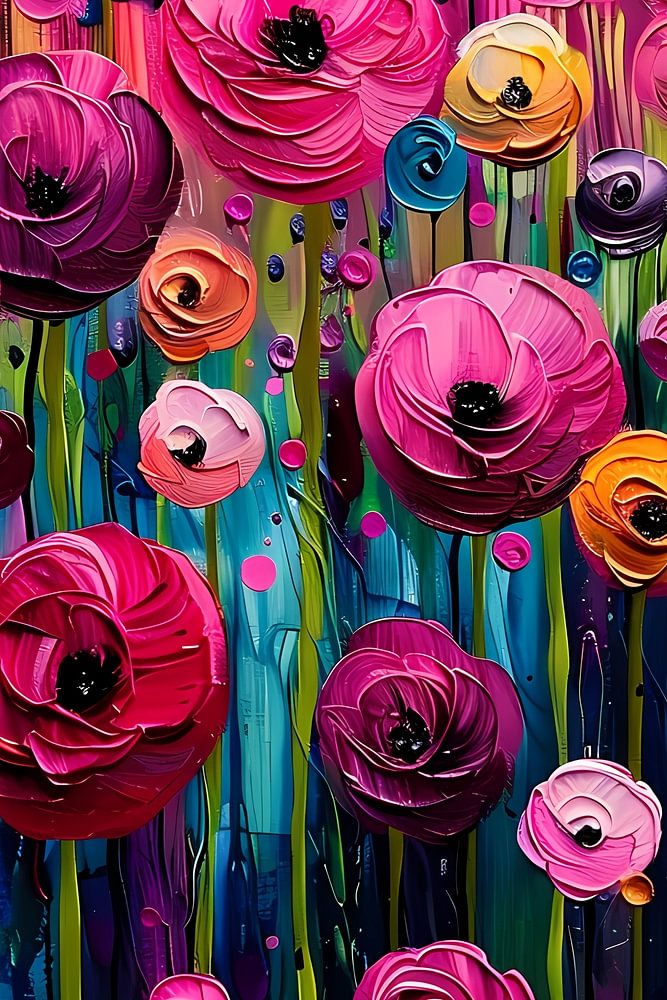Dieses farbenfrohe und bewegte Kunstwerk lädt den Betrachter ein, sich in einem Meer aus rosa, lila, grünen, gelben und orangefarbenen Blumen zu verlieren. Jede Blume, einzigartig geformt mit dicken Pinselstrichen, schafft eine fast taktile Textur, die die Sinne anregt. Dieses Gemälde ist ideal für ein modernes Wohnzimmer oder ein auffälliges Stück in einem kreativen Büro und verspricht, jeden Raum mit einem Spritzer Farbe und natürlicher Schönheit zu verwandeln.
