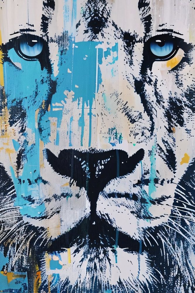 Dieses wunderschöne Pop-Art-Gemälde eines Löwen bringt Energie und Farbe in jeden Raum. Mit leuchtenden Blau-, Gelb- und Weißtönen, kombiniert mit kräftigen schwarzen Linien, zieht dieses Kunstwerk sofort die Aufmerksamkeit auf sich. Das kraftvolle Porträt des Löwen strahlt Stärke und Majestät aus und eignet sich perfekt, um ein Statement in Ihrem Interieur abzugeben. Der dynamische Einsatz von Farben und der einzigartige Street-Art-Stil machen dieses Gemälde zu einem echten Blickfang. Dieses Kunstwerk ist ideal für moderne Innenräume und verleiht ihnen nicht nur einen visuellen Reiz, sondern auch ein Gefühl von Charakter und Stil. Hängen Sie es in Ihrem Wohnzimmer, Büro oder Schlafzimmer auf, um ein künstlerisches Flair zu schaffen.