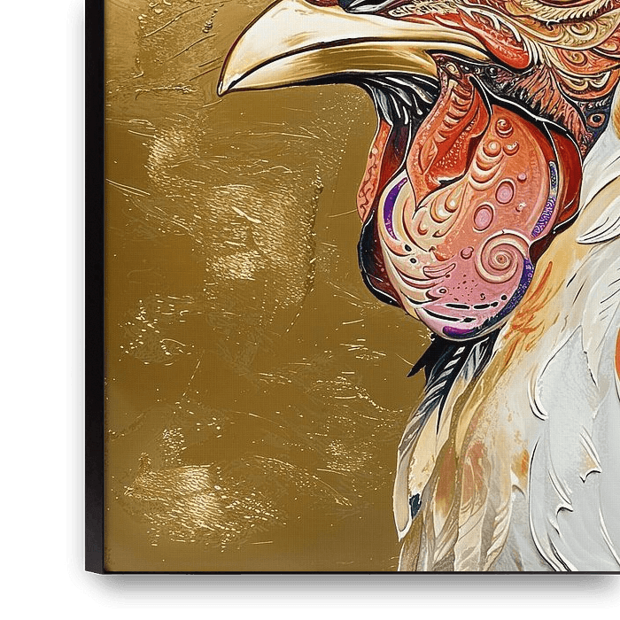 Vivid Gaze Glory - Dieses Gemälde zeigt ein majestätisches und lebendiges Porträt eines Hahns. Der Kunststil scheint eine ausdrucksstarke und moderne Kombination aus Realismus und surrealistischen Einflüssen zu sein. Am auffälligsten sind die leuchtenden und vielfältigen Farben des Gefieders des Hahns, das mit reicher Textur gemalt ist.…