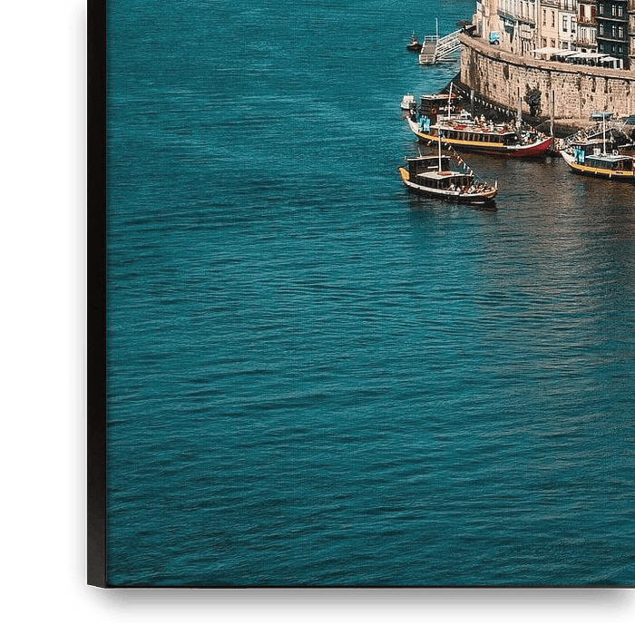 Bestelle das Foto Lebendiges Porto: Historische Häuser und Boote am Wasser von NZME Photography als Reproduktion auf Leinwand, Alu-Dibond, als Poster, Fototapete oder Acrylglasbild.