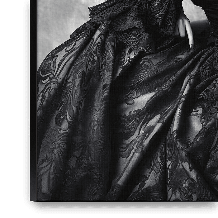Fantasievolles Porträt einer Frau in einem Kleid aus Spitze und Leder mit einem großen Spitzenhut.
