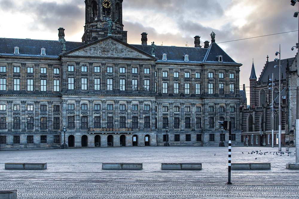Ein leerer Damm während der Koronazeit gibt ein schönes Bild von den Gebäuden, die dort stehen