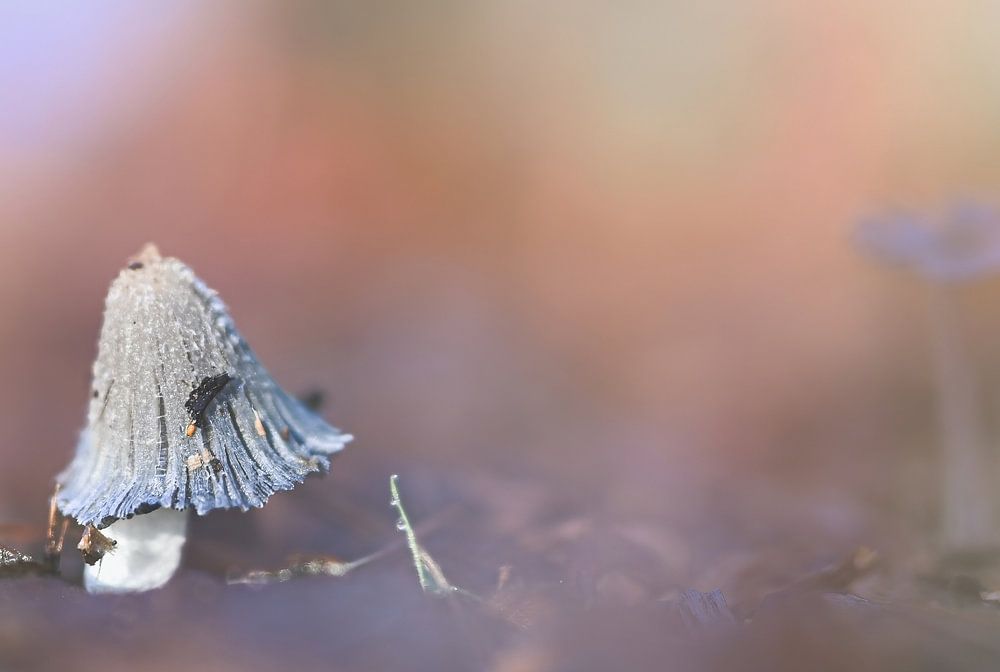 Nahaufnahme eines gerade auftauchenden pilz in der Nähe des Leersumer Feldes. Der Hintergrund ist weich und enthält herbstliche Pastellfarben.