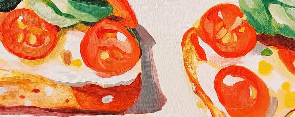 Details: kulinarisch, Gemälde, Food Art, Tomate, Basilikum, Ricotta, Brot, gesunde Rezepte, italienische Küche, vegetarisch
