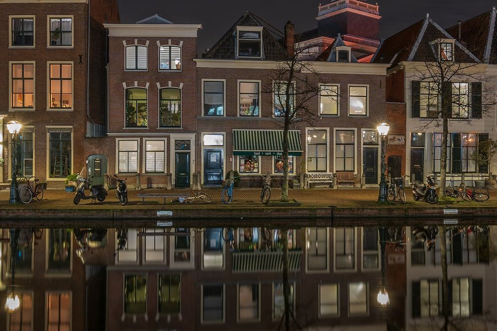 Der Rhein fließt durch Leiden. Dieses Bild zeigt die spiegelnden Häuser im Wasser des Rheins am Apothekersdijk