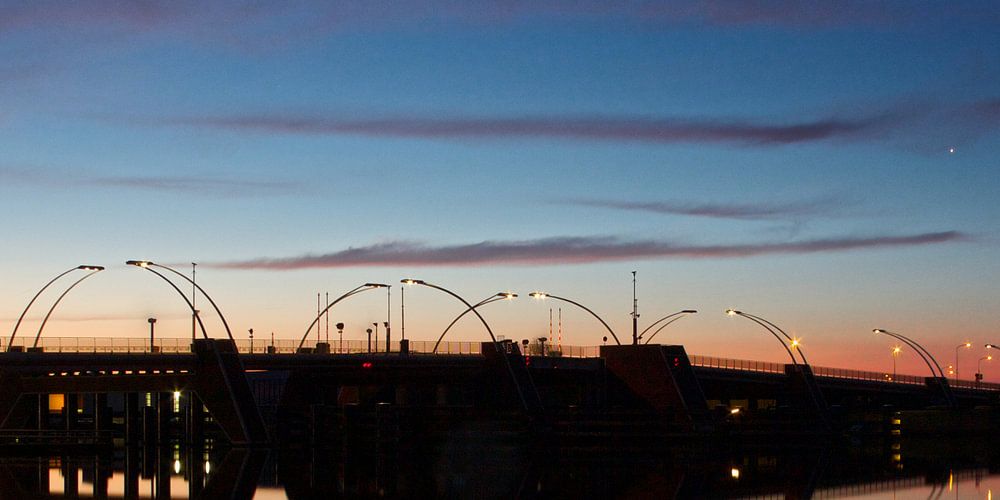 Een kleurrijke, vroege ochtendlucht boven het Spaarne en de Schoterbrug in Haarlem.