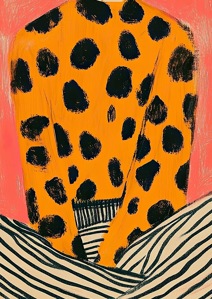 Eine flache Illustration einer Frau in schwarz-weiß gestreiften Hosen, die einen übergroßen Pullover mit Leopardenmuster trägt, im Stil von Matisse, rosa-grün-orangefarbener Hintergrund, fette Linien, strukturierte Details, skurriler Kinderbuchillustrator