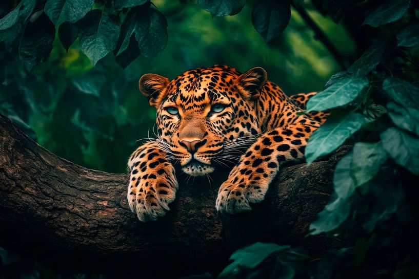 Unbemerkt und majestätisch, ein gefleckter Jäger ruht in der grünen Umarmung der Äste. Die schimmernden, goldenen Tupfer seines Fells strahlen im sanften Licht und erwecken den Eindruck von unbändiger Kraft und Anmut. Ein Blick, durchdringend und geheimnisvoll, erzählt von der Wildnis und der ungezähmten Schönheit des Dschungels.