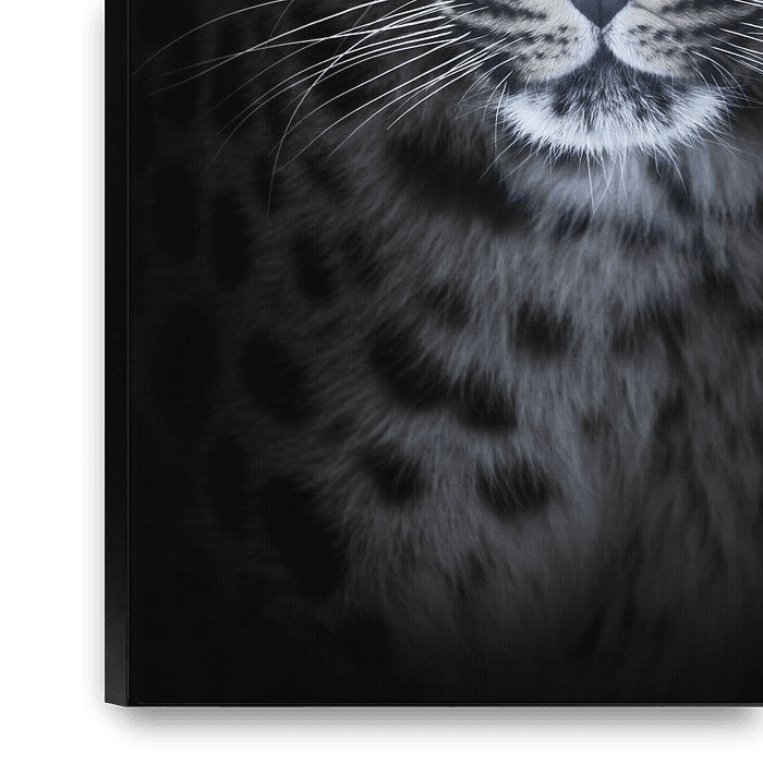 Bestelle das digitale Kunst Bild Leopard in der Nacht Mondlicht, blaue Augen leuchten, verfärbte Fell schwarzen Hintergrund, volles G von Michael Semenov als Reproduktion auf Leinwand, Alu-Dibond, als Poster, Fototapete oder Acrylglasbild.
