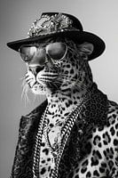 Ein ausdrucksstarkes Schwarz-Weiß-Foto eines Leoparden gekleidet mit einem verzierten Hut, Sonnenbrille und Schmuck. Perfekt für modebezogene Themen.