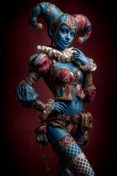 Ein auffälliger Narr in einem leuchtend blauen Hautton, der die verspielte und skurrile Natur des Narren unterstreicht. Die Figur nimmt eine selbstbewusste Pose ein und strahlt Charme und Schalk aus. Die Gesamtkomposition fängt das Wesen eines mittelalterlichen Narren ein und lädt den Betrachter in eine Welt der Fantasie und Farbe ein.