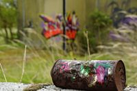 Im Vordergrund liegt eine stark verrostete Farbdose auf einer verwitterten Betonfläche. Ihr Metall ist von Rost zerfressen, die Oberfläche rau, brüchig und von dunklen Braun- und Rotnuancen durchzogen. Zwischen den Oxidspuren blitzen Reste kräftiger Farbe hervor – Pink und Grün –, als stumme Erinnerung an ihre ursprüngliche Funktion:…