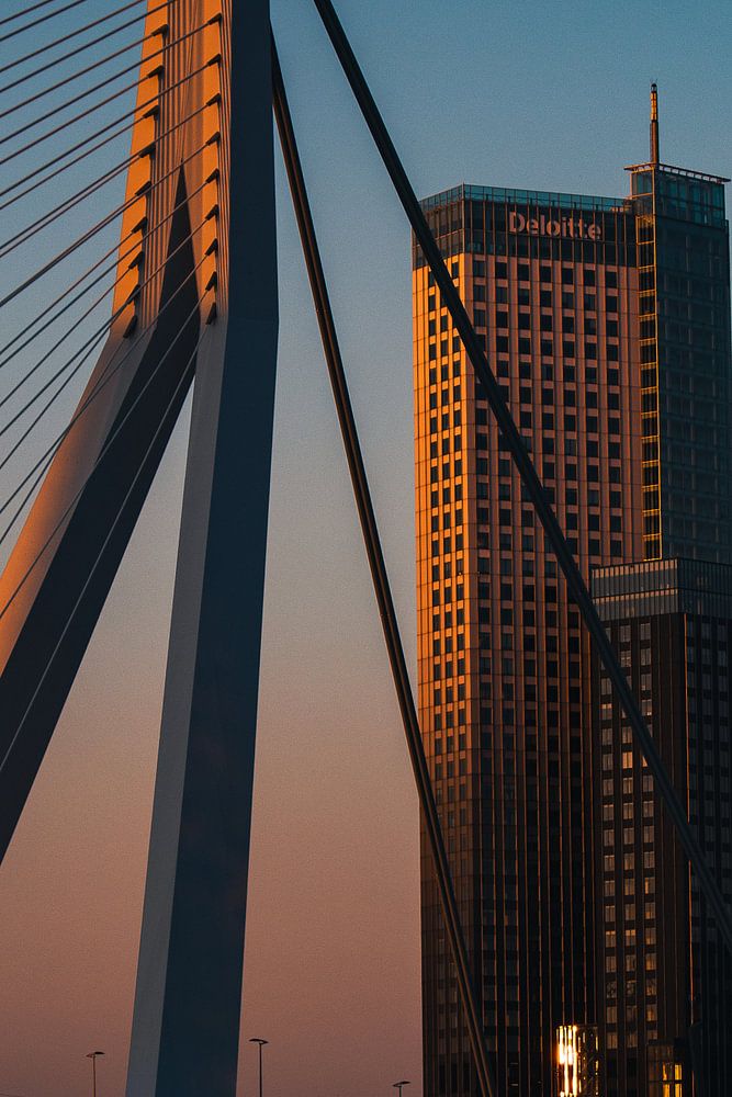 Die Erasmusbrücke, das Wahrzeichen von Rotterdam, bei Sonnenuntergang an einem schönen Sommerabend. Die Sonnenstrahlen geben ein schönes oranges Leuchten auf der Brücke und den Gebäuden dahinter. Das orangefarbene Glühen bildet einen schönen Kontrast zum blauen Himmel der blauen Stunde.