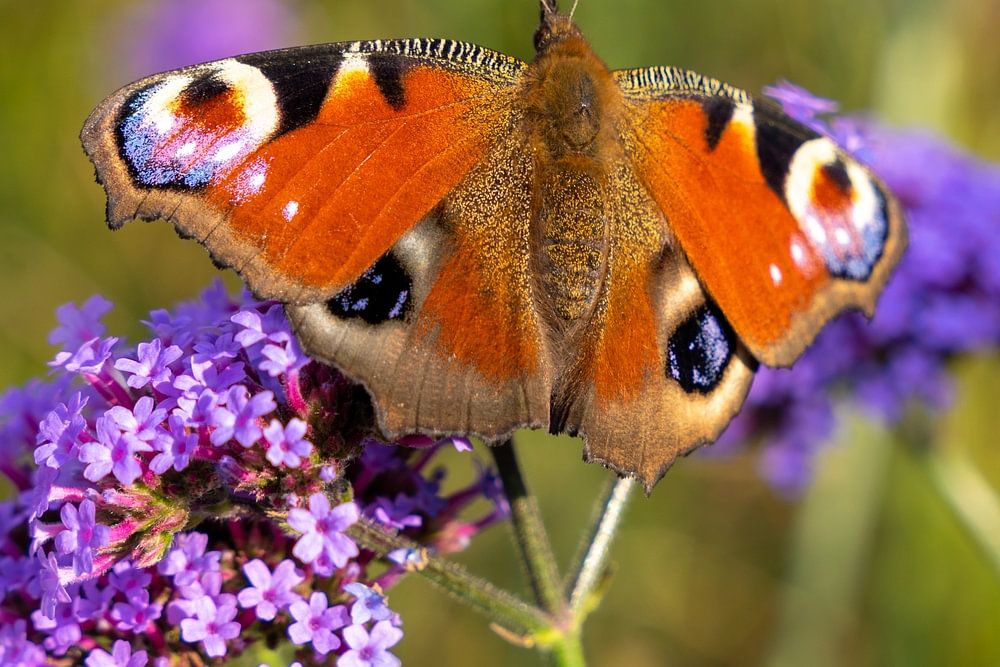 Leuchtend farbiger Schmetterling (Aglais io oder Tagpfauenauge) auf violetter Blüte (Verbena bonariensis). Überwiegend grüner und teilweise lilafarbener unscharfer Hintergrund.
