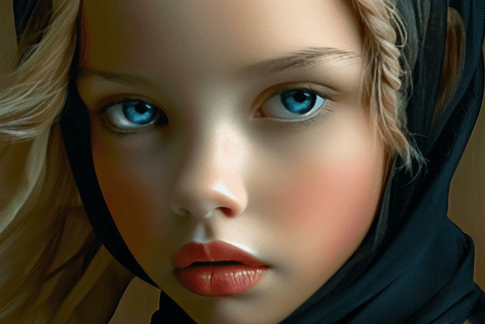 Eine bezaubernde Verschmelzung von Epochen und Technologien! Diese von der KI erstellten Porträts von Mädchen mit leuchtenden Augen erwecken die Pracht der niederländischen Malerei des siebzehnten Jahrhunderts auf klassische und innovative Weise zum Leben.