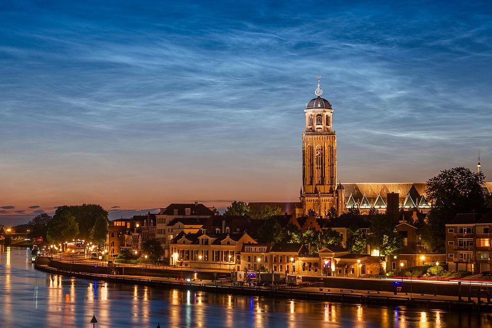 Leuchtende Nachtwolken über der Skyline von Deventer, während des längsten Tages am 21. Juni 2021