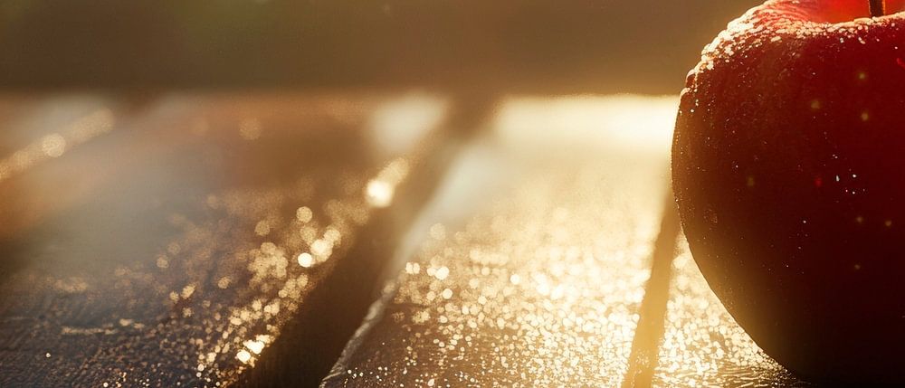 Eine leuchtend rote Apfelperle ruht sanft auf einer glänzenden Holzoberfläche, eingefangen im warmen Licht des frühen Morgens. Der feine Glanz der feuchten Oberfläche vermittelt Frische und natürliche Schönheit. Dieses Bild ist eine perfekte Ergänzung für die Küche, wo es den Charme von Genuss und Gastfreundschaft widerspiegelt.