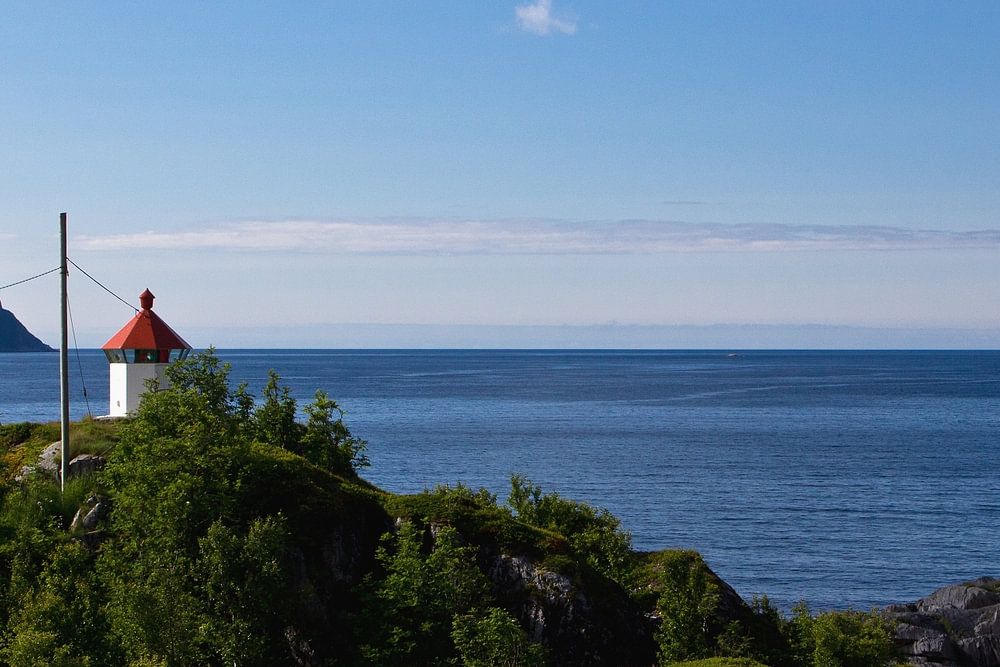 Kleiner Leuchtturm auf der Insel Husøy mit Bergen in der Ferne bei Senja im Norden Norwegens