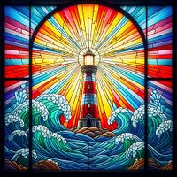 Ein cooler rot-weißer Leuchtturm am Meer im Buntglasdesign