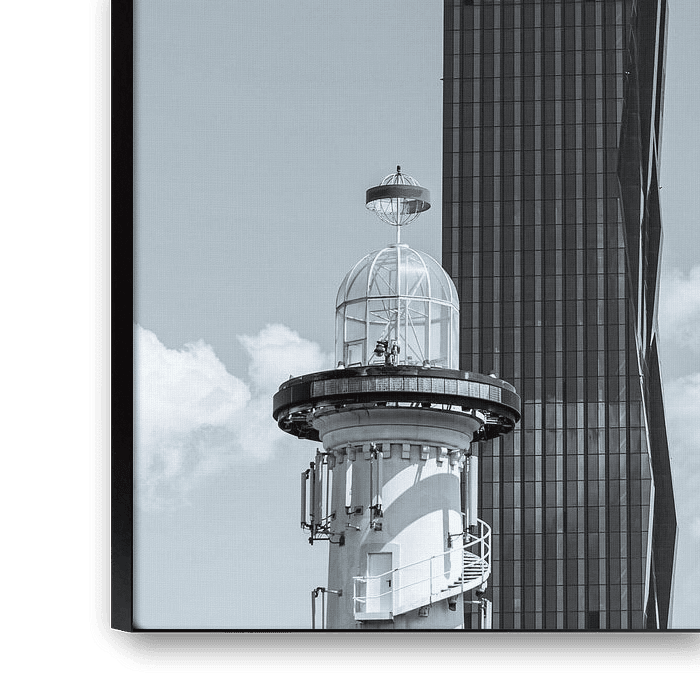 Schwarzweißfotografie Alter Leuchtturm auf der Donauinsel und das Hochhaus DC Tower 1, Teil der DC Towers im Stadtteil Donau City in Wien, Österreich