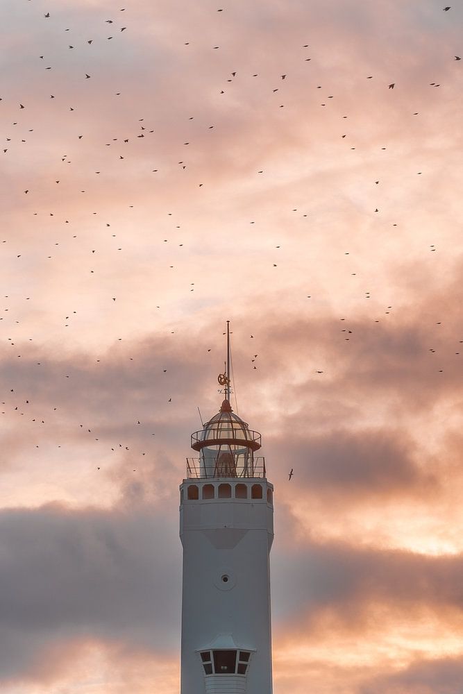 Leuchtturm von Noordwijk bei Sonnenaufgang und ein Vogelschwarm.