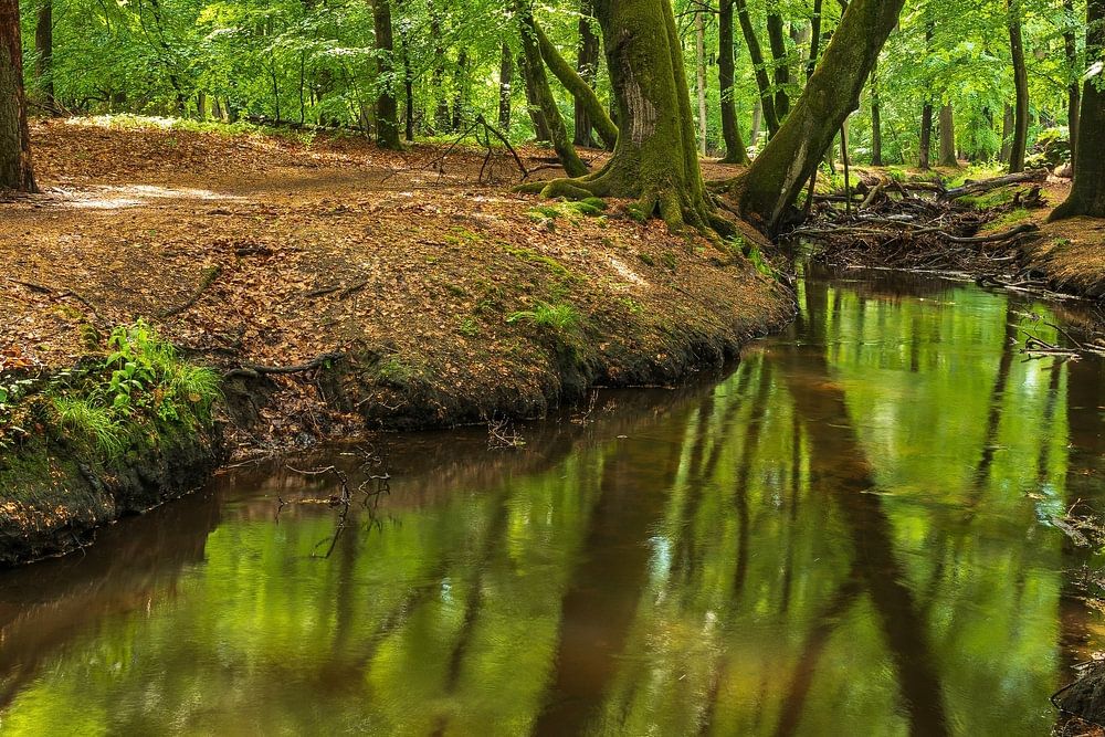 Die Hierdensche Beek im Wald von Leuvenum in der Veluwe. Das Foto wurde im Frühjahr aufgenommen. Die Blätter, die im vergangenen Herbst gefallen sind, sind noch nicht verrottet und färben den Boden rötlich-orange. Die Bäume sind noch hellgrün und spiegeln sich im sanft fließenden Wasser. In diesem Bild sind also zwei Jahreszeiten eingefangen. Dieser Bach wird auch Leuvenumse Beek und Staverdense Beek genannt, je nach dem Gebiet, in dem er fließt. Die Vereniging Natuurmonumenten ist Eigentümerin des Naturschutzgebiets und verwaltet es. Bekannte Orte in der Umgebung sind Ermelo, Nunspeet, Elspeet und Putten.