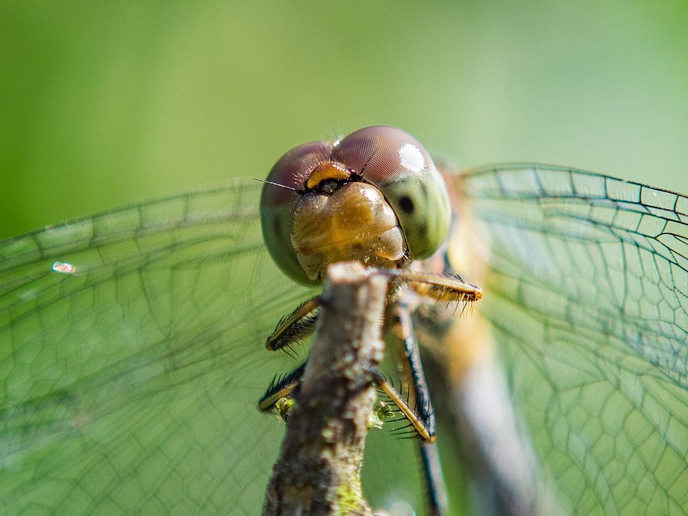 Ein Sommerfoto von einer Libelle vor einem grünen Hintergrund aus Büschen. Ich konnte mich diesem Exemplar mit meiner Kamera aus kurzer Entfernung nähern. Libellen legen manchmal eine kurze Pause ein, um sich in der Sonne aufzuwärmen. Die wunderschön gemusterten Flügel reflektieren das Sonnenlicht auf brillante Weise, und wenn man genau hinsieht, kann man auch die Facetten, die die Augen auf dem Kopf bilden, sehr gut erkennen. Ich finde, sie gehören zu den schönsten Insekten, die es gibt. Sie sind zwar Raubtiere, aber sie schaden dem Menschen nicht.