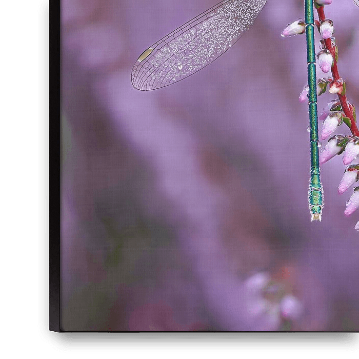 Bestelle das Foto Libelle in den Tropfen von Angela Kraan als Reproduktion auf Leinwand, Alu-Dibond, als Poster, Fototapete oder Acrylglasbild.