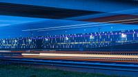 Die Fassade des riesigen DSV-Gebäudes im Logistikpark Moerdijk ist mit unzähligen Lampen und Lichtern geschmückt. Das bietet bei Einbruch der Dunkelheit und in der Nacht ein ganz besonderes Schauspiel. Ein vorbeifahrender Lkw verursacht auf dem Foto Lichtstreifen, die das Bild in der blauen Stunde besonders dynamisch wirken lassen...