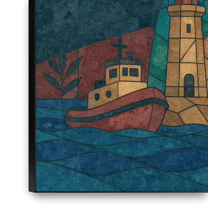 Dieses ausdrucksstarke kubistische Kunstwerk vereint maritime Elemente in einer farbintensiven Komposition: Ein großer Dampfer mit drei Schornsteinen, ein kleiner Schlepper im Vordergrund und ein strahlender Leuchtturm bilden das Zentrum der Szene. Die geometrisch segmentierte Darstellung erinnert an ein modernes Mosaik, wobei kräftige…