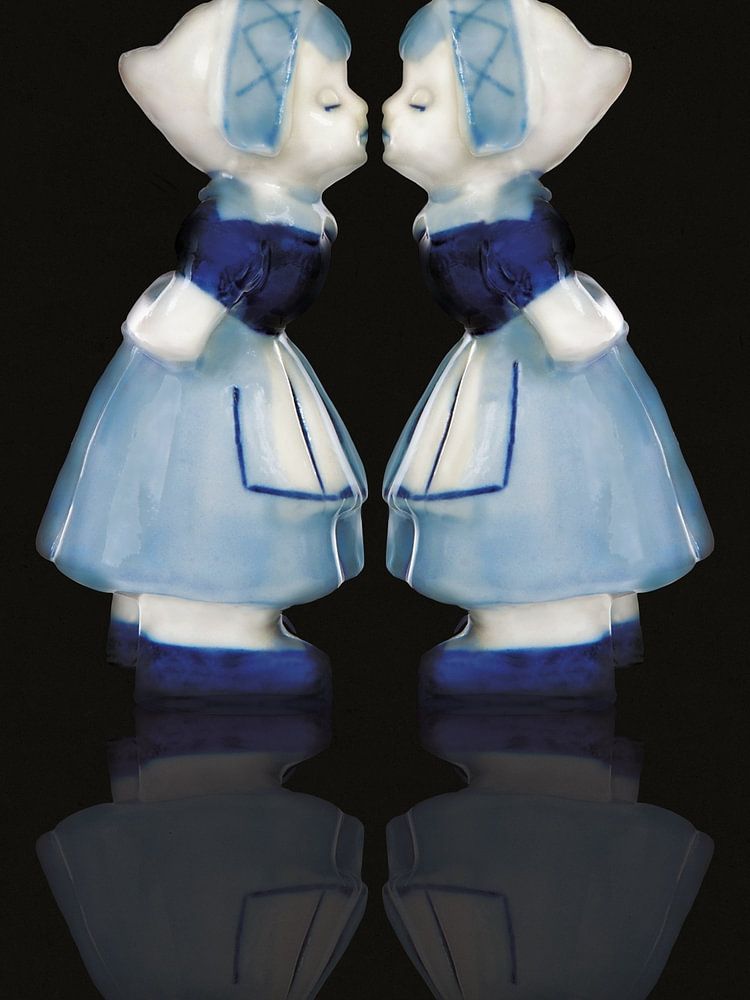 Delfter Blau küssendes Paar, Frauen. Für ein modernes Aussehen auf schwarzem Hintergrund platziert. Es lebe die Liebe und unsere Freiheit!