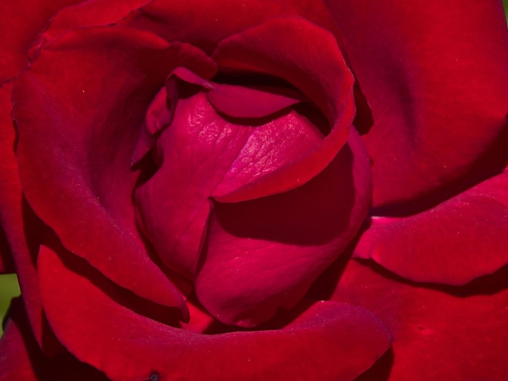 Nahaufnahme einer großen Rosenblüte mit dunkelrotem Farbton umgeben von grünen Blättern an einem sonnigen Tag im Sommer.