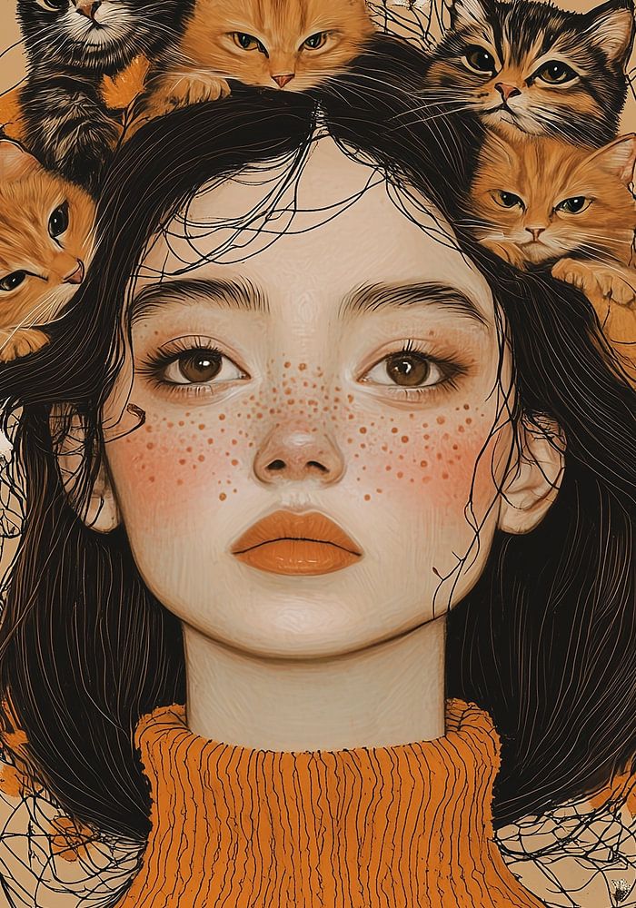 Porträt einer Frau/Mädchen mit einer Vorliebe für Katzen. Die Katzen liegen herrlich auf ihrem schwarzen Haar inmitten von weißen und orangefarbenen Blumen. Sie trägt einen orangefarbenen Rollkragenpullover. Feine, dünne, organische, schwarze Linien machen es zu einem fesselnden Ganzen. Katze am Revers. Gestreifte Katze. Fantasie.