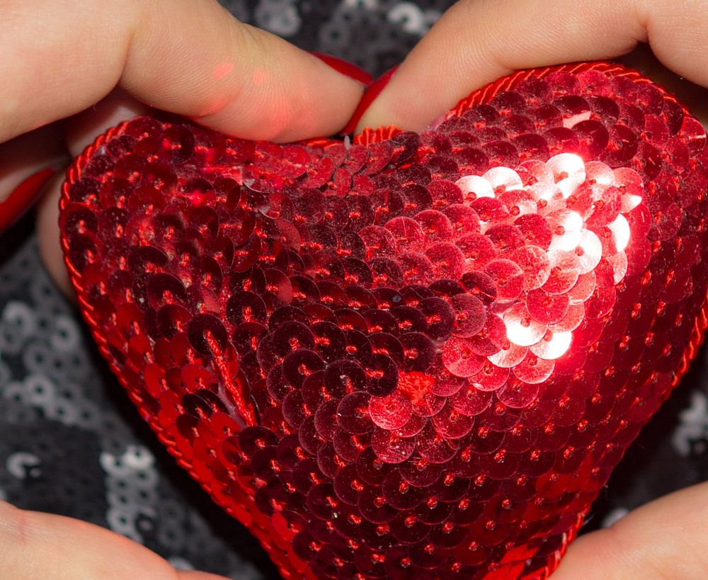 zwei Hände bilden ein rotes Paillettenherz im Bokeh eines schwarzen lbd Partykleides