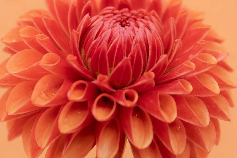 Ich habe diese blühende Dahlie in Orange- und Rottönen vor einem hellorangenen Hintergrund fotografiert.
