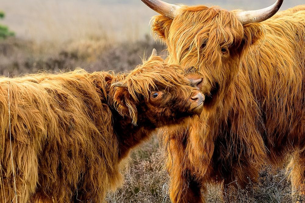 Eine schöne Kombination aus einer schottischen Hochlandhündin und ihrem Jungtier. Ob es Liebe zwischen diesen Tieren ist, weiß ich nicht. Vielleicht ist das das Bild, das wir von ihnen haben und auf sie übertragen wollen. Dass sie füreinander da sind, darüber lässt sich sicher streiten, denke ich.