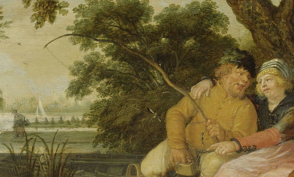 Vinckboons kam im Alter von nur 15 Jahren aus den südlichen Niederlanden nach Amsterdam. Dieses Gemälde aus seinen späteren Jahren kombiniert eine flache Landschaft im Hintergrund mit einem Waldinterieur, das flämischen Traditionen folgt, im Vordergrund. Die dargestellte Genreszene, zwei Liebende, die von hinten beobachtet werden, hier in einer modernen, ungezwungenen Weise wiedergegeben, hat eine lange Tradition.