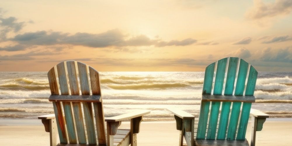 Ein fotorealistisches Bild von zwei Liegestühlen an einem Strand bei Sonnenuntergang.