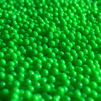 Ein großer Haufen grüner Kugeln mit geringer Schärfentiefe. 3D-Rendering/-Raytracing mit warmem Farbton.