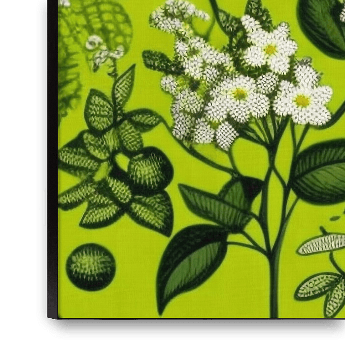 „Limettenblütenvergnügen“ zeigt zarte weiße Blütenbüschel, die von kunstvoll gemusterten grünen Blättern umgeben sind, die sich vor einem leuchtend limonengrünen Hintergrund abheben. Die helle, fröhliche Farbpalette und die detaillierten botanischen Elemente sorgen für eine lebendige und skurrile Ästhetik. Subtile Texturen und…