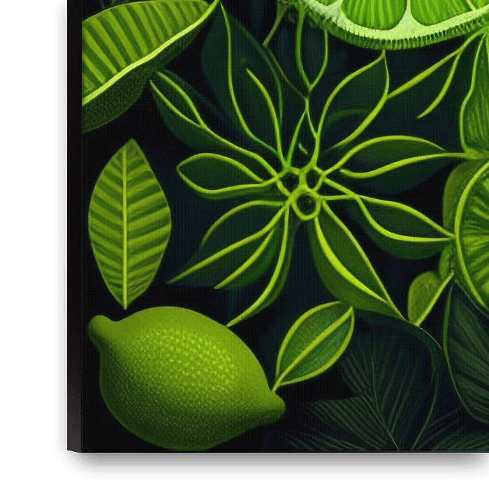 „Limettenhain Erfrischung“ fängt die Essenz tropischer Vitalität mit seinen leuchtend grünen Limettenscheiben, ganzen Limetten und üppigem, detailliertem Laub ein. Vor einem dunklen Hintergrund hebt die Komposition die hellen Zitrustöne und die filigranen Blattmuster hervor und schafft so einen auffälligen visuellen Kontrast. Das Bild…