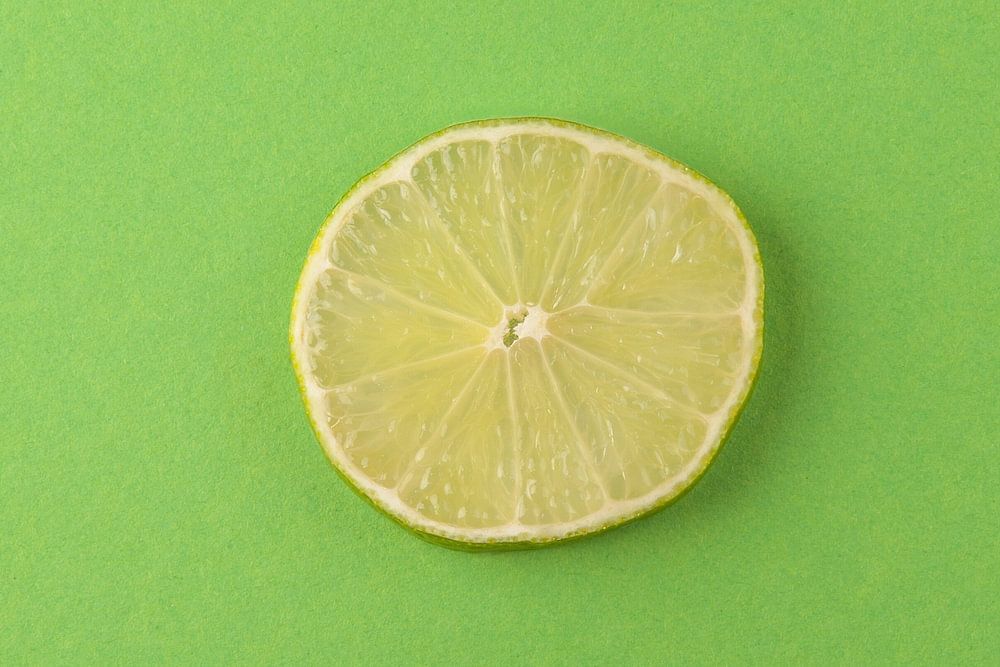 Scheibe Limette (Zitrusfrucht) vor grünem Hintergrund, leicht säuerlicher Geschmack, gesund und bunt.