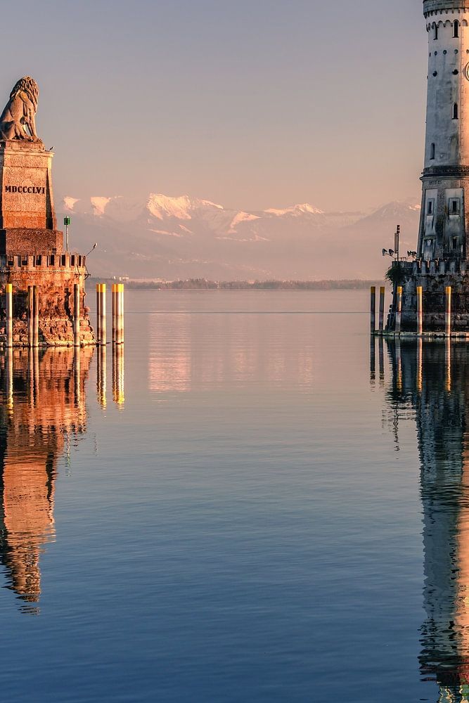 Der idyllische Leuchtturm im Hafen von Lindau am Bodensee und schneebedeckten Bergen im Hintergrund zum Sonnenuntergang.