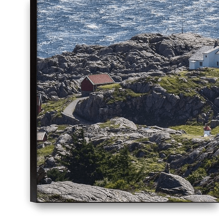 Der Leuchtturm von Lindesnes auf seiner Felsspitze am südlichsten Punkt Norwegens, an einem sonnigen, aber windigen Sommertag.