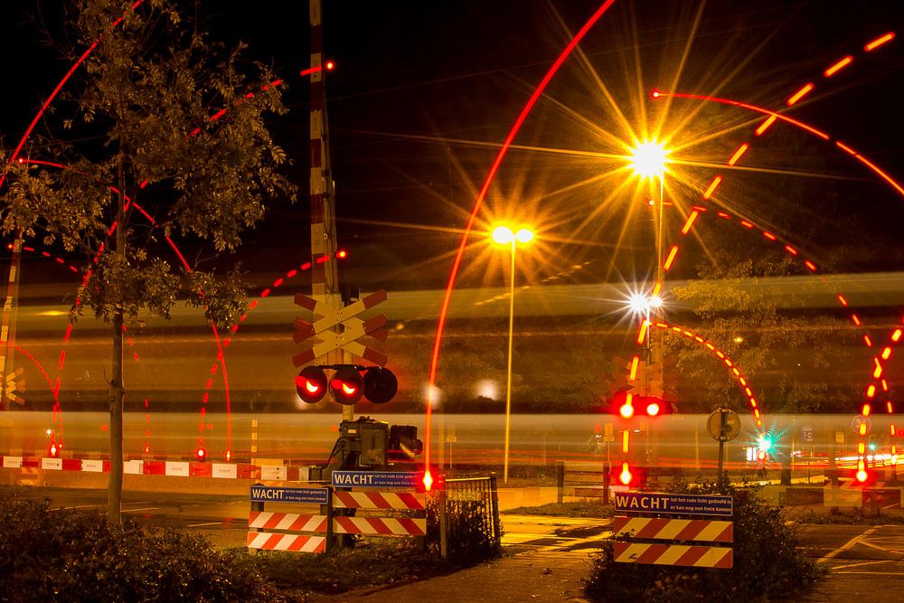 Bahnübergang in Aktion. Der vorbeifahrende Zug wird durch die lange Belichtungszeit als Lichtspur dargestellt. Bahnübergang Wheermolen in Purmerend