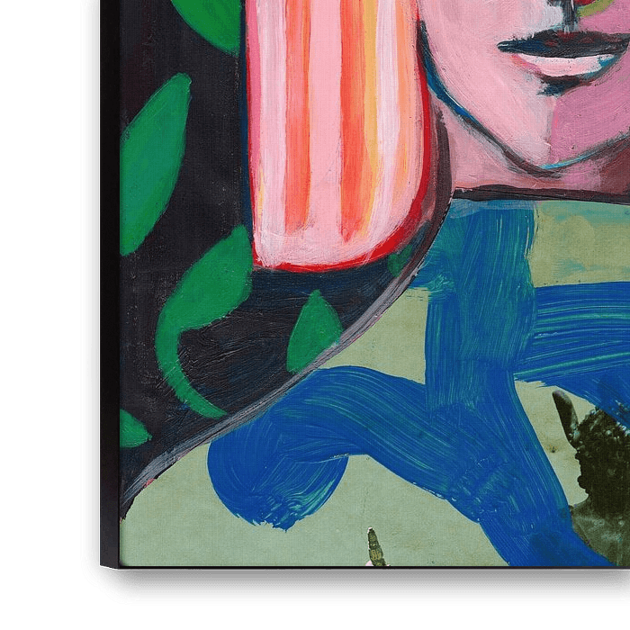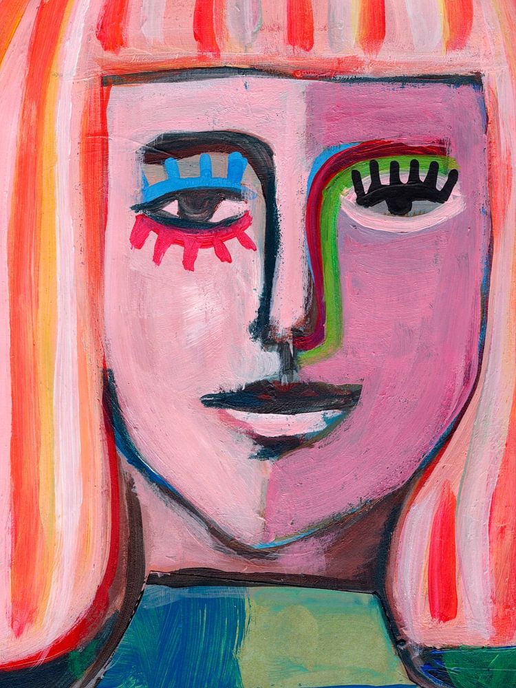 Dieses Porträt wurde mit Acryl und einer Collage aus Papier mit abstrakten Mustern erstellt. Das Kunstwerk hat eine Menge Farbe.