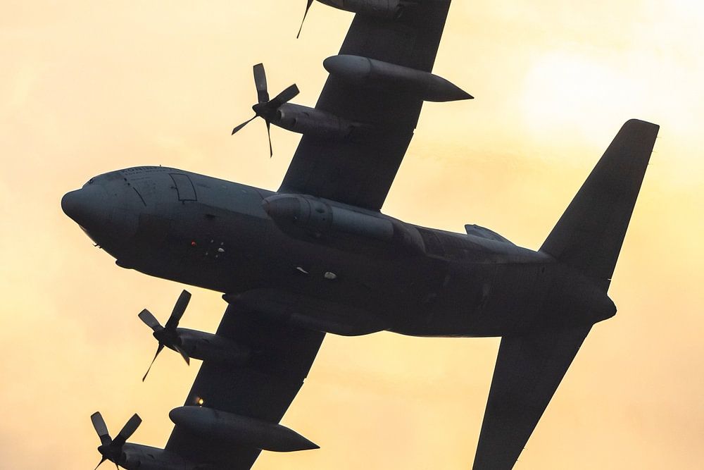 Lockheed C-130 Hercules der Königlichen Niederländischen Luftwaffe im Flug bei Sonnenuntergang in der Nähe des Flugplatzes Deelen im Naturschutzgebiet Veluwezoom in Gelderland, Niederlande. Das Transportflugzeug Lockheed C-130 Hercules ist ein amerikanisches viermotoriges Turboprop-Militärflugzeug, das von Lockheed Martin entwickelt und gebaut wurde. Diese G-781 (Bob van der Stok) ist auf dem Flughafen Eindhoven stationiert und nimmt an einer gemeinsamen NATO-Übung auf dem Flughafen Deelen bei Arnheim teil.